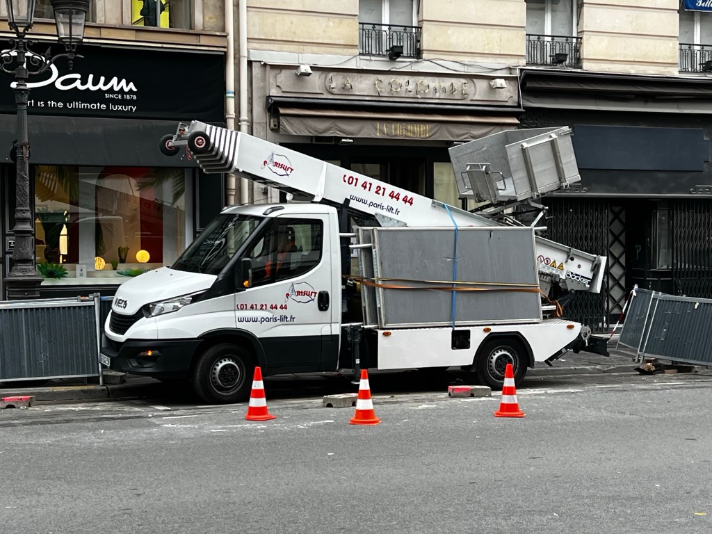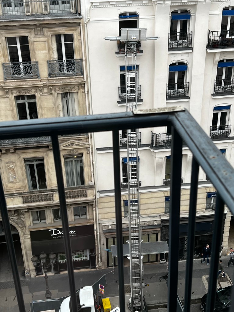 Apartment buildings in central Paris can be 6+ stories tall, so renovations take a different approach. Across the street from us, I saw a ladder that reached up five stories (the sixth story window was open though). They were sending sheetrock panels up the ladder to the workers inside. This view was taken from our balcony on the 6th floor. Video (YouTube)