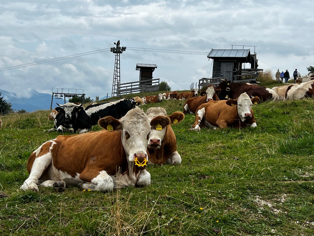To enter the Rossfeld Panoramastraße region , there’s a toll booth , which costs 9€ for cars. The road continues on up to the apex, where there’s parking for cars and buses and a small restaurant. There weren’t many people here today (Wednesday), in fact far more cows than people. The cattle graze along the slope near the restaurant, with an electric fence keeping them enclosed and the steep down slope at the top ensures they aren’t wandering off.