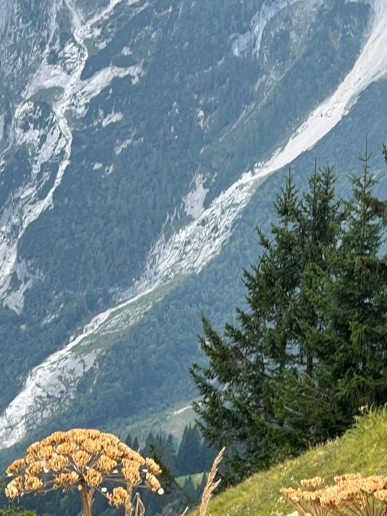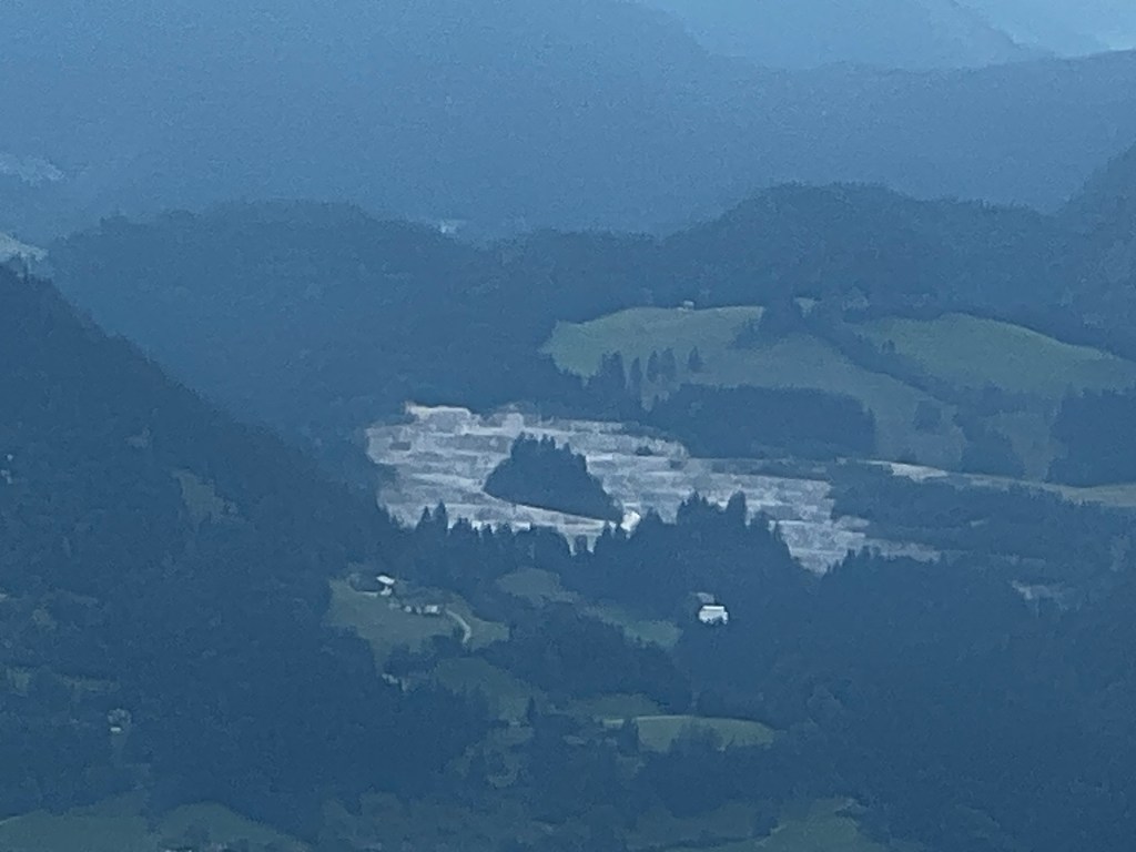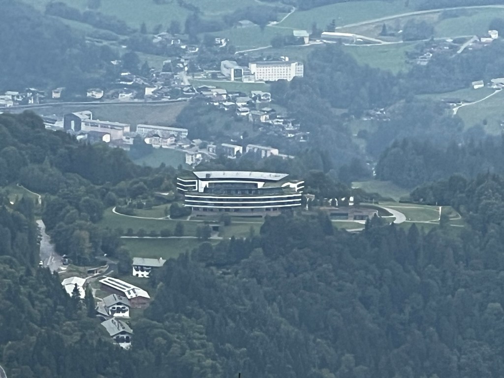 Walking through the electric gate and up the cow patty path, we reached the trail that goes along the summit, with a ski lift that operates in the winter, going down to Obersalzburg. If you know what you’re looking for, the views down show the intermediate levels where the Grand Kempenski hotel and the Dokumentation Center are located (which is the departure point for the Eagles Nest). We stayed at the (now) Kempinski a few times, years ago, once, when we visited the Dokumentation Center and Eagles Nest. The Dokumentation Center seems to be temporarily closed, reopening at the end of this month.