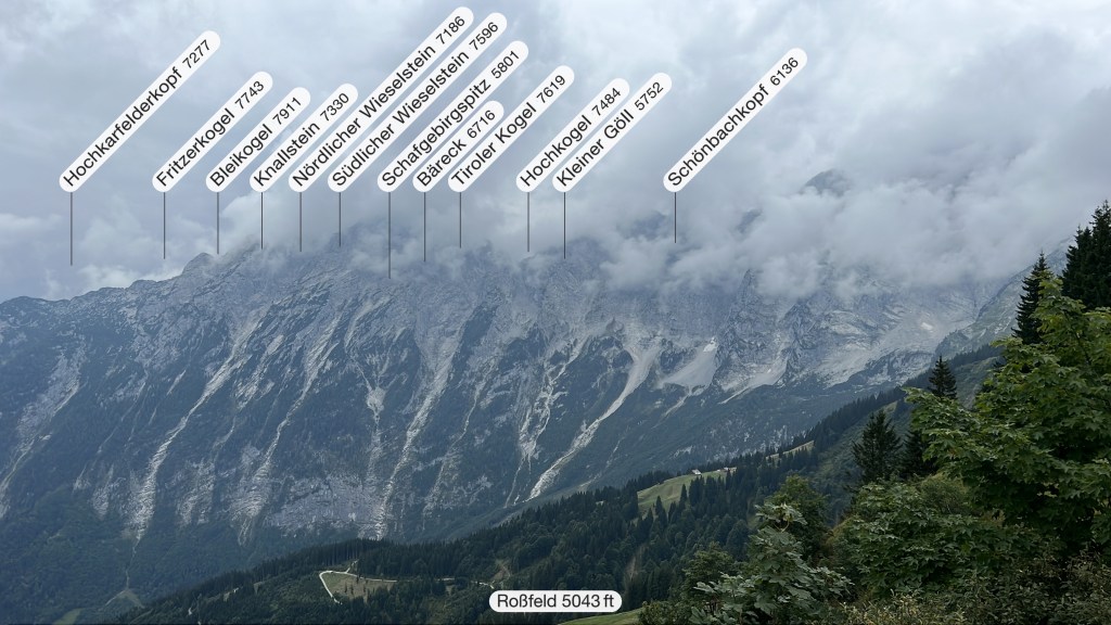 Though it is mostly cloudy today, we decided to take the drive up to the Rossfeld Panoramasteaße, a scenic alpine road providing views of the Hohen Göll, the Kehlstein, the Tennen- and Dachstein Mountains, the Untersberg as well as over Berchtesgaden (Germany) and Salzburg (Austria). At the apex , the elevation is about 1600 meters (5250’). It is Germanys highest panoramic road.