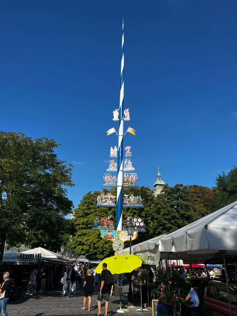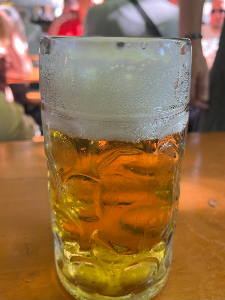 The Viktualienmarkt is not far away and we left Hofbräu to have lunch over there. It’s a beautiful day and the Biergarten is packed. It took a while to find two seats together at an unreserved table. Some restaurants have sections of reserved tables, but there’s a large open seating area if you can find seats. Once we did find seats, my wife held our spot while I went off to buy Ein Maß (9.80€)