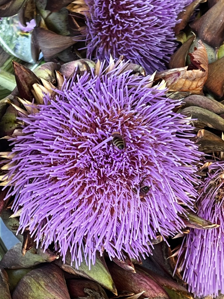 After finishing our beer, we strolled around the Viktualienmarkt and some of the various food, flower and gift stalls. The Viktualienmarkt is where their Maypole is located. The flower stall had some flowering artichokes on display and the bees love them.