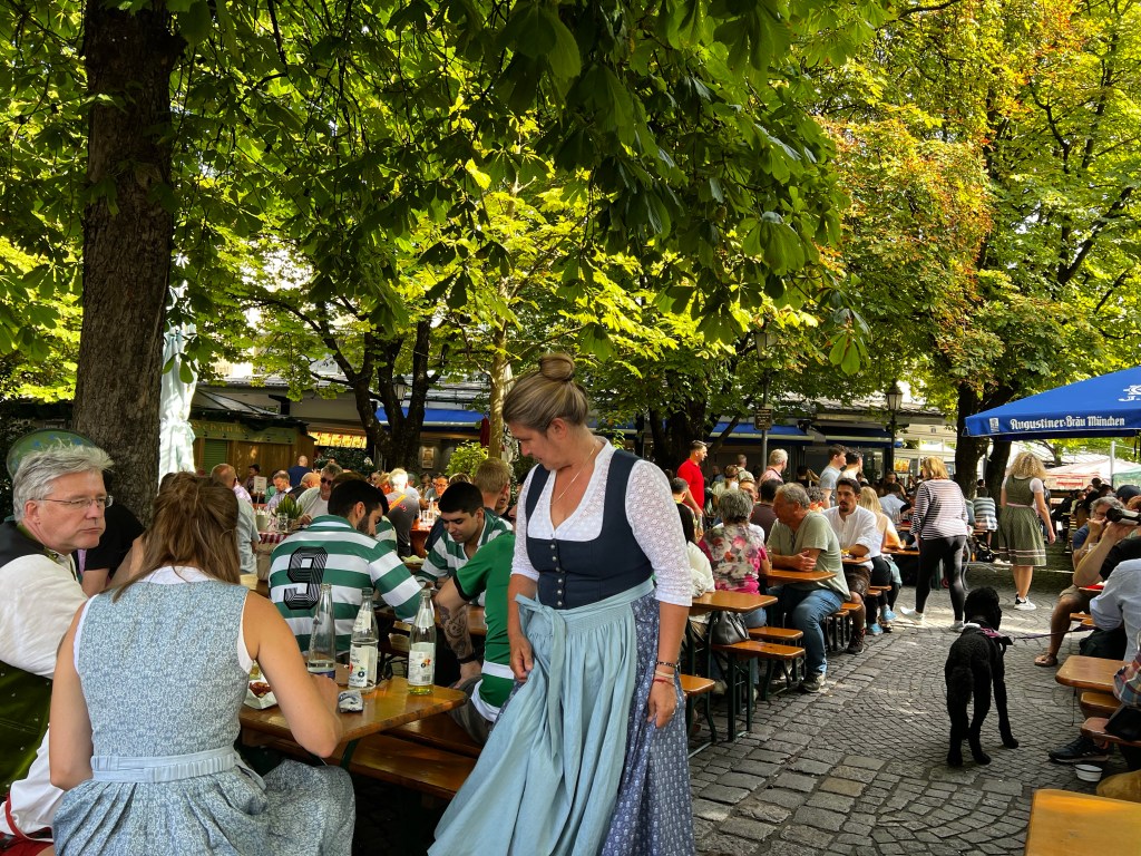 We took the U back to the Marienplatz to have lunch at the Viktualienmarkt. Unlike the US, all the retail stores are closed (by law – Ladenschlussgesetz) on Sunday (“blue law”), with only restaurants, grocery stores , etc. allowed to be open. All of the farmers’ market type stalls in the Viktualienmarkt are closed, but the Biergarten is open! First stop is …beer, but there’s a small band playing (YouTube) under the chestnut trees. With Oktoberfest underway, it’s definitely less (but not un)crowded.