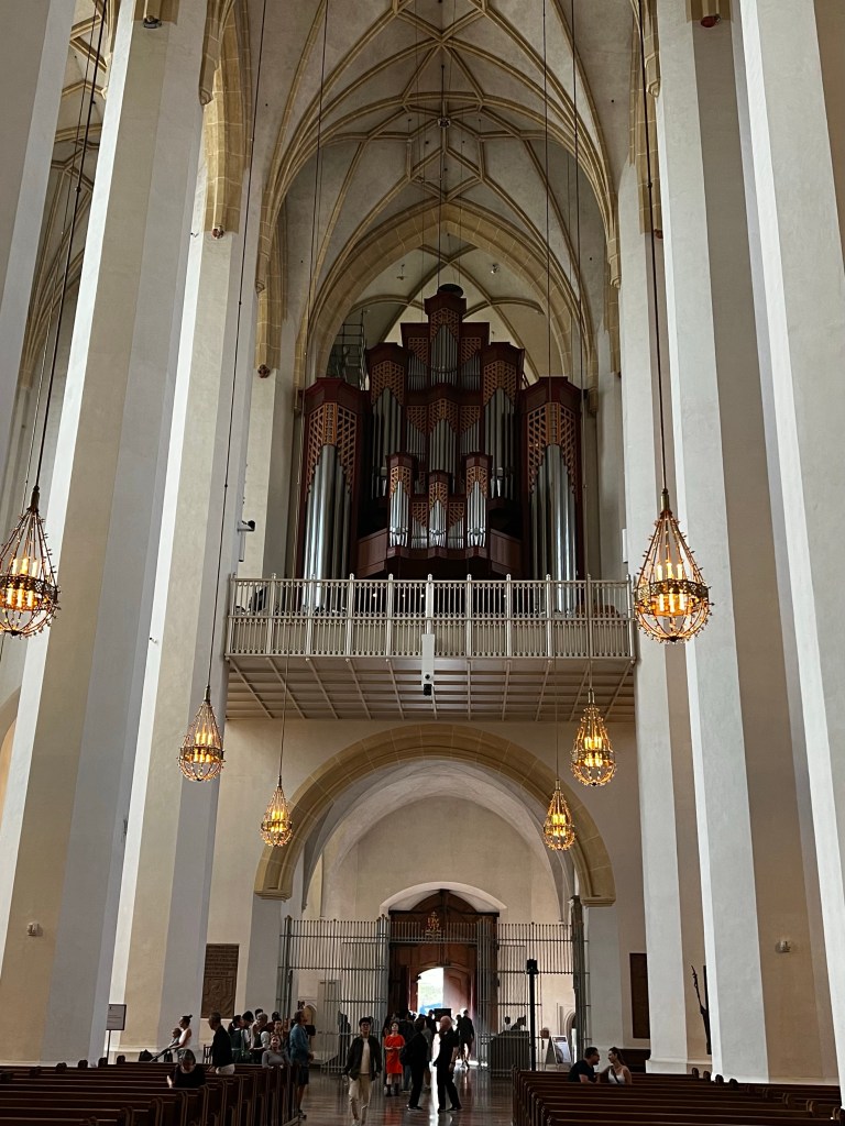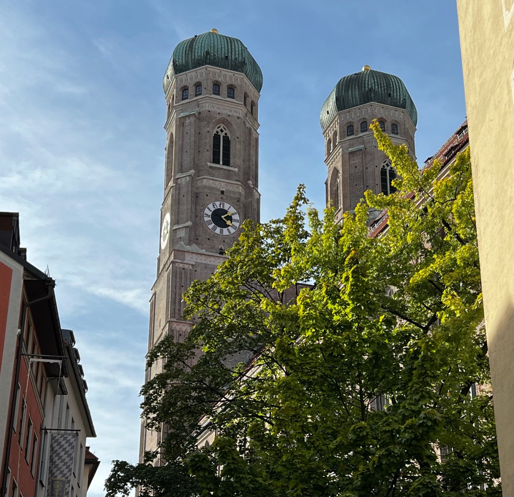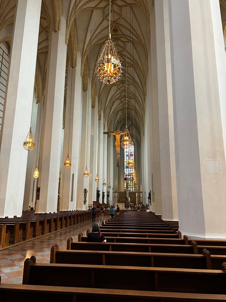 After lunch (more than just a bier), we walked back towards the Frauenkirche. Fortunately, the cathedral is open; many times when we’ve been here the last few years, it was undergoing restoration (outside). With a structure this old (consecrated 1494), it’s in a continual state of restoration, inside and/or outside. Unlike other buildings of its era, the building was constructed using bricks to save money due to the lack of quarries in the region.