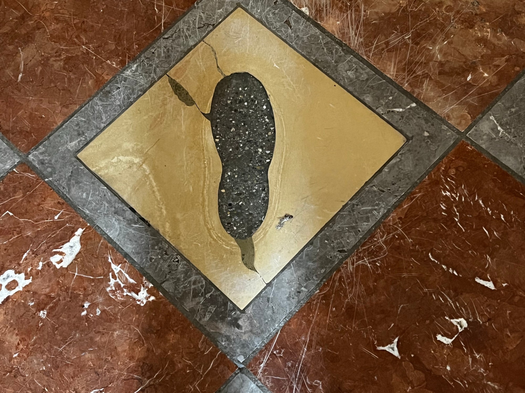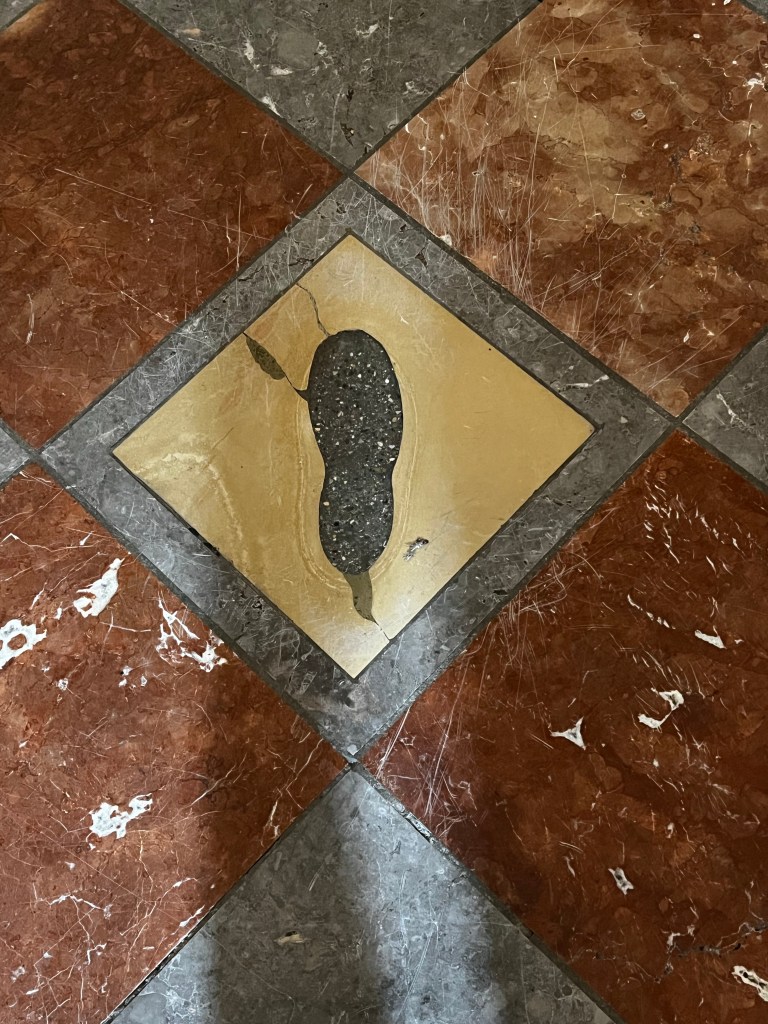 When the building was complete, von Halspach led the Devil inside to survey his work, and to show him that he had held up his end of the bargain. Although there was light, there seemed to be no windows, and the devil was satisfied. But then when he took another step further, the columns that had been blocking the view of the windows opened up and, in his fury at being tricked, he stamped his foot, forever marking the floor with his black footprint.