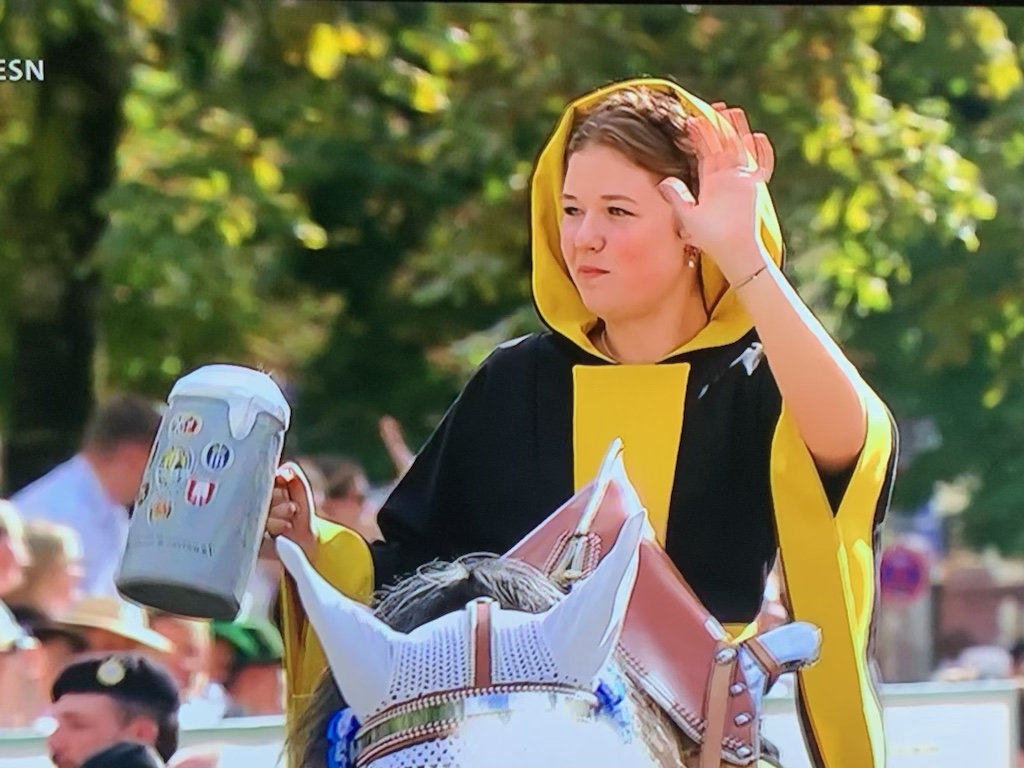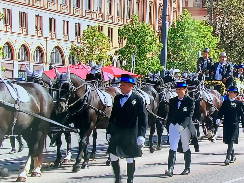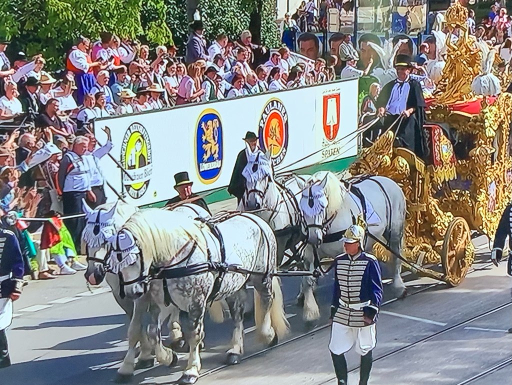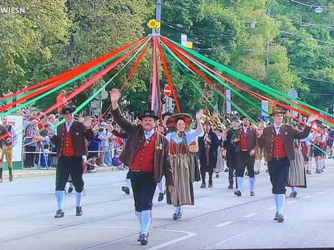 We watched some of the costume “Trachten und Schützenzug” parade on TV, much better views than we’d have had in person. Around 9,500 participants form a seven-kilometer-long train across Munich city center. They come not only from all parts of Bavaria, but also from other federal states and European neighboring states: dressed traditional costume groups, sports and mountain shooters, music bands, musician and fanfare suits, in between the magnificent horse drawn teams of the Munich breweries and many festival carriages and floats on which old crafts or customs are shown. This year, the Bavarian Traditional Costume Association, with 1,600 participants, has a special presence. 140 years ago, the first traditional costume club in Bavaria was founded in Bayrischzell in the district of Miesbach (about 40 minutes south of Munich); this was the impetus for a nationwide traditional costume movement and today there are around 800 clubs with 160,000 members in Bavaria. Many of them had on elaborate traditional “costumes” or regionalized traditional clothing.