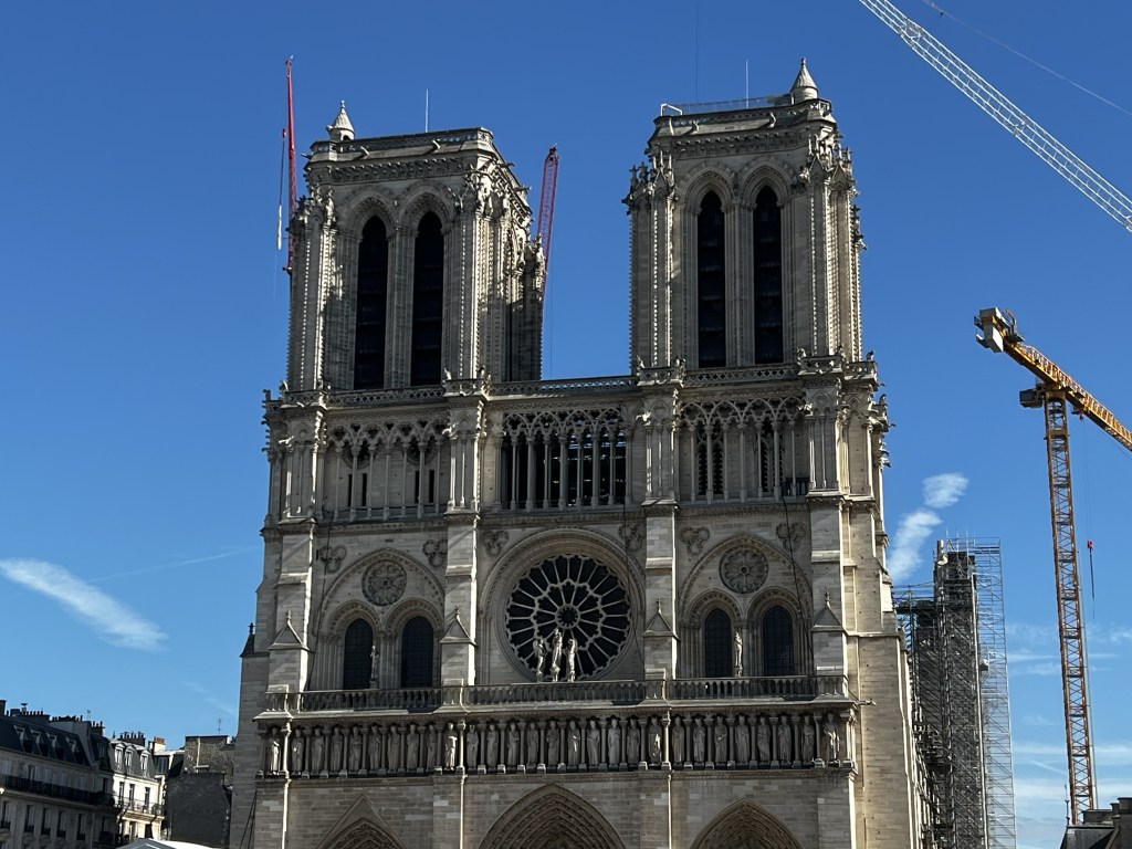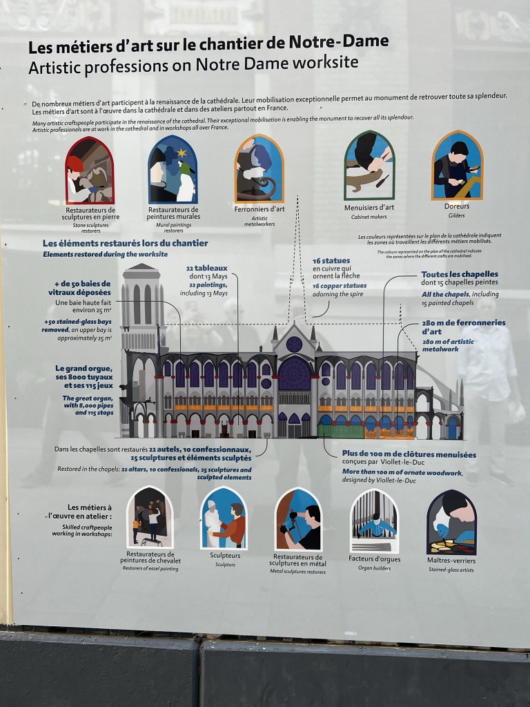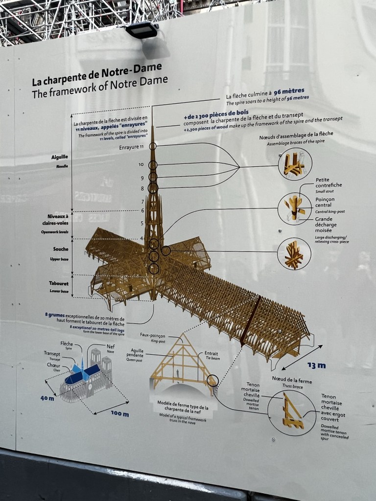 From here, we wanted to revisit Notre-Dame to see how the reconstruction after the devastating fire of 2019 was progressing. We visited the site in 2022, which was still in the very basic stages of inventorying and removing the damaged sections and melted scaffolding. It’s impossible to describe the scope of such a restoration project for a building that is 800 years old. The amount of detailed planning, engineering, technology and all the trades – both modern and even medieval crafts you would not have thought about, that have been enlisted to restore this historic church and symbol is staggering, all with painstaking detail, to restore the church and its paintings, stonework, stained glass, art restorers, carpenters, stone mains, organ builders. 11 organ builders were brought together to dismantle the great organ, with all 8,000 pipes and 115 stops being dismantled and sent to three different workshops for cleaning. Over 1,000 old trees were felled (from private and public lands) to construct the supports and framework , with each one numbered for its purpose. It must be the engineering and construction project of the century, and for these craftsmen, of a lifetime.