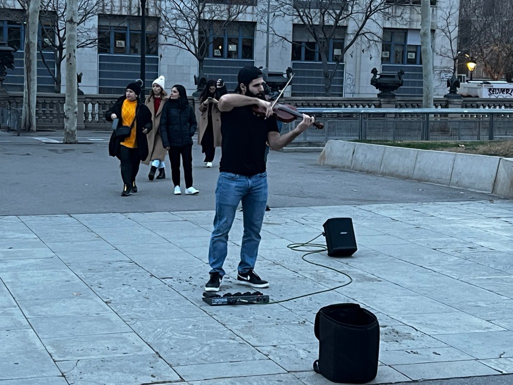 The promenade is a really wide pedestrian walkway, bounded on both side by streets. All along the promenade are ornate street lights and there are a few street musicians playing, one a violinist who was very good.