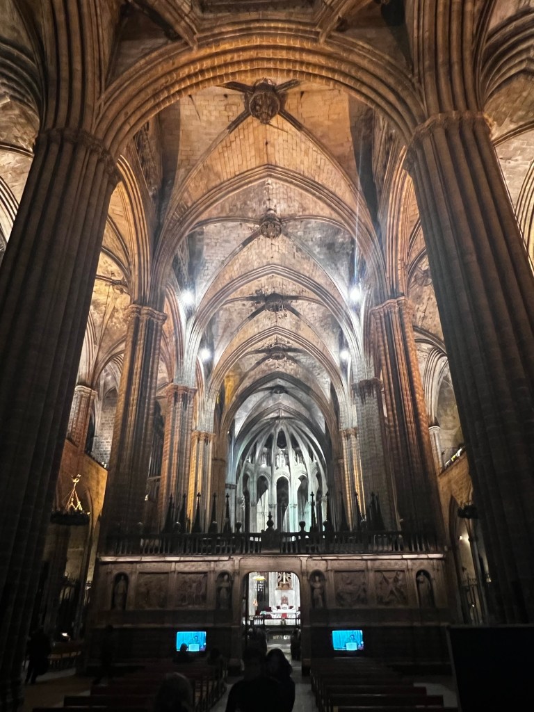 We did not walk all the way to the park, but turned at the monument and crossed the Passeig de Lluis into the quarter where we hoped to find our churros and hot chocolate (at a restaurant recommended by our hotel concierge) . We stopped at the Cathedral of the Holy Cross where a service was in progress.