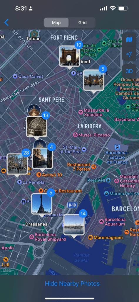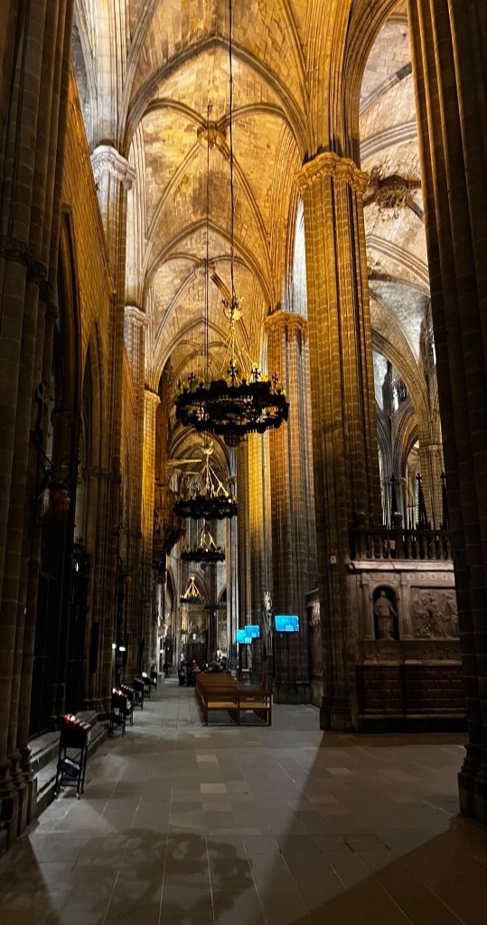 From here, we continued on down the path (can hardly call this a street) to the Basilica Santa Maria del Pi, a 15th-century Gothic church. Also known as the Blessed Lady of the Pine Tree (one of the titles of the Virgin Mary). The church was most likely built between 1319 and 1391. It opened on 17 June 1453. There is a large Plaça (public square) outside with (not a coincidence, I’m sure) a large pine tree. It too has services going on.