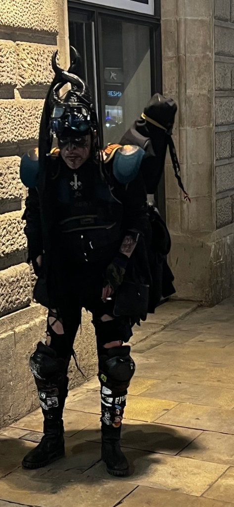 Moving on, we walked down the crowded narrow streets, with their Christmas lights still hanging (though not lit) overhead. Though it’s dark, it’s only 6:30pm. The shops and restaurants are all open. As always, a wide variety of people.