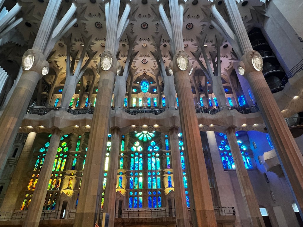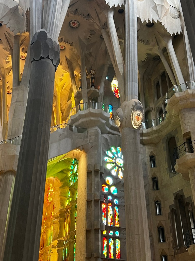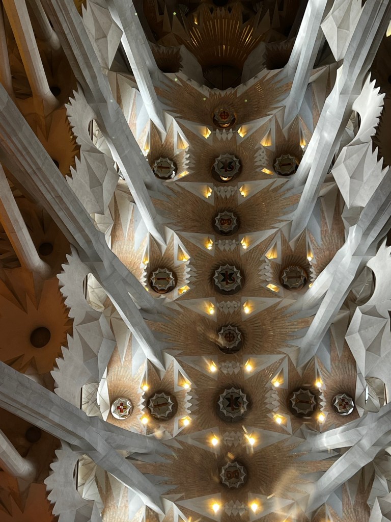 La Sagrada Familia is symbolic of the lifetime of Christ . As you tour the church, nature is everywhere, from plants and animals in the sculpture and the brass doors on one side, to the enormous columns (the “forest) seemingly reaching to the sky, to the stained glass windows that (on one one side) reflect the sunlight of the morning and on the other, the setting sun of the evening. “There are no straight lines or sharp corners in nature. Therefore, buildings must have no straight lines or sharp corners.” The columns’ design resembles a stone forest showcasing powerful tree trunks reaching for the sky, complete with branches and leaves at the top. Gaudi orchestrated every detail here, even selecting the varied types of stone for the pillars to optimize weight distribution. This is true throughout the church, where it seems there are hardly any straight lines and only curves. Gaudi was nicknamed to be God’s architect by his contemporaries, for his epiphany was that man creates with straight lines, while God fills nature with graceful curves, angles, and colors.