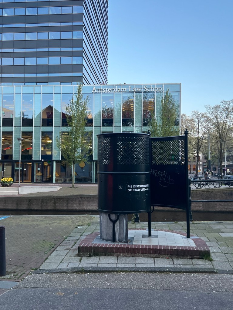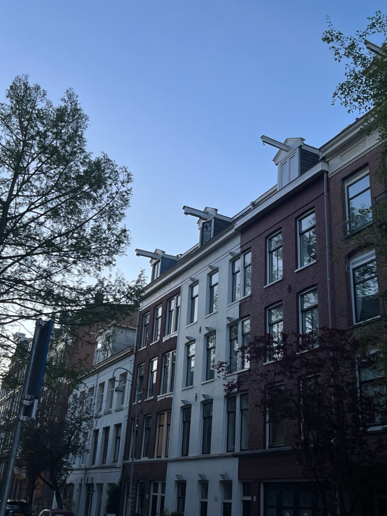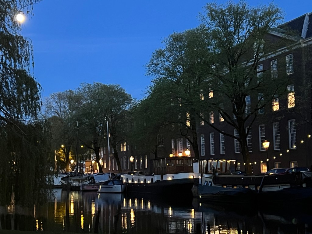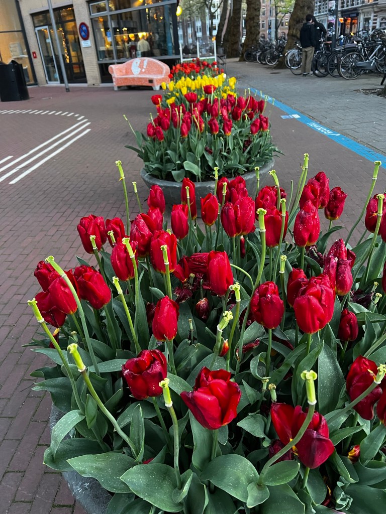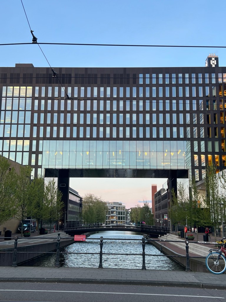 Not having much sleep on the plane, we crashed out for a few hours before heading out in the early evening for a walk towards De Hortus Botanicus . We didn’t expect it to be open this time of day (though we have visited before), it was just a destination to walk towards. Along the way, we walked past the University of Amsterdam Law School and Business School, located along (surprise!) a canal. The walkways are littered with the fallen white petals of the blooming trees.