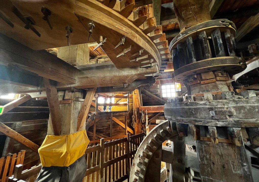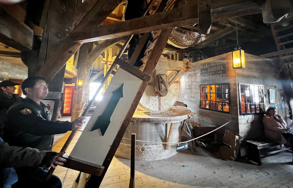 There’s a short line to go into De Kat and we pay the 6€ entrance fee and walk through the lower floor where the (wooden) machinery and huge grindstone are located.