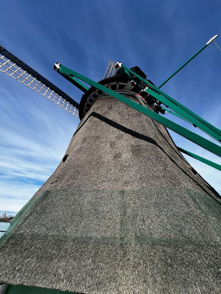 As we’d later learned, these windmills had specialized purposes, and it wasn’t to pump water to keep the land behind a dyke dry. Some grind flower, one grinds materials to make paints; we’ll visit de Kat later and climb up inside. There are a few sawmills (Houtzaagmolen), a spice mill , a flour mill (Meelmolen), an oil mill (Oliemolen). molen= mill.