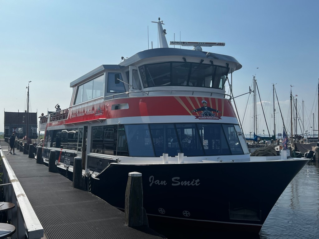 We bought tickets for the 2:15pm 30 minute trip across the lake (12.5€ each) to Volendam; a few people rode up with their bicycles (slightly higher fare). The ferry comes into the harbor where all the sailboats are moored and made a three point turn to position it to head back out once incoming passengers disembarked and departing passengers embarked. It’s two decks, with the lower deck covered and the upper deck partly covered. It’s a beautiful sunny and warm day, so I spent part of the trip out on the deck taking photos, but the covered section up top was still warm.