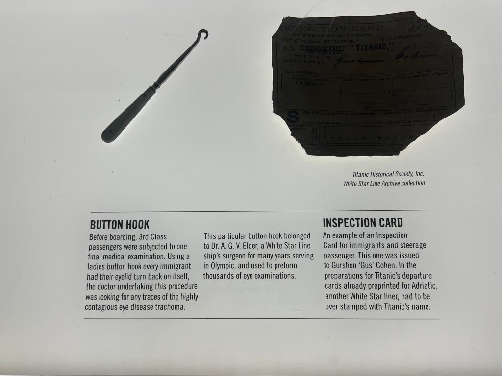Titanic’s launch for her maiden voyage was watched by an estimated 100,000 people in Belfast. The departure from Southampton (YouTube) was April 10, 1912. The Titanic had three classes of passengers, ranging from the ultra luxurious first class to pretty basic third class. The ship was designed with very high quality fittings and accommodations for (first class) passengers , while the mire class passengers had to endure a medical exam for a contagious eye condition before they were allowed boarding. Using a ladies button hook every immigrant had their eyelid turn back on itself, the doctor undertaking this procedure was looking for any traces of the highly contagious eye disease trachoma.