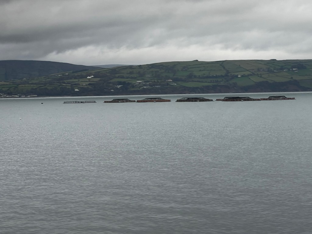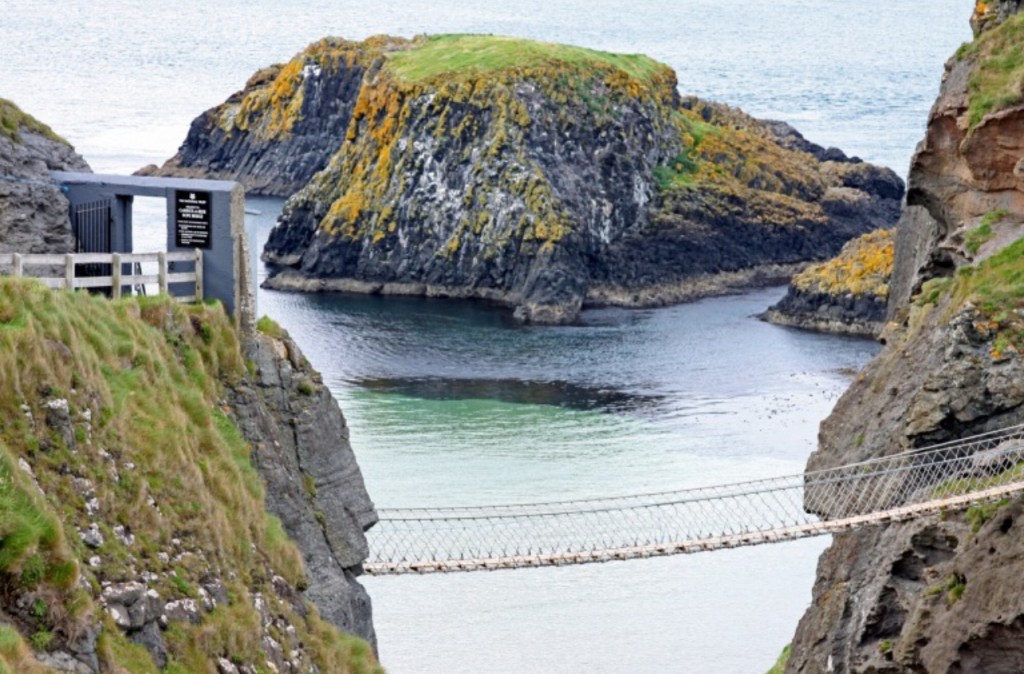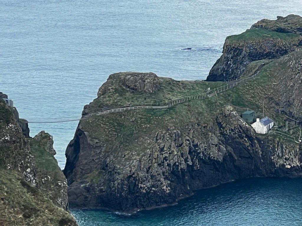 Carrick-a-Rede is closed to high occupancy vehicles like bus tours, but we visited it in 2016, so all we had today were more distant views. Carrick-a-Rede is a rope suspension bridge built between the mainland and an island, by salmon fishermen who discovered they could easily trap the salmon who swam between the island and the mainland. This was risky work, but it worked so well that the salmon were pretty well wiped out. So now salmon are raised in pens offshore.