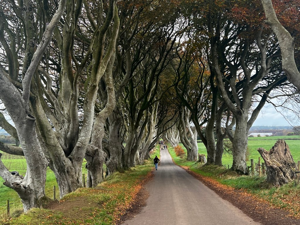 Now we’re moving on towards the Dark Hedges. The Dark Hedges is an avenue of beech trees along Bregagh Road between Armoy and Stranocum in County Antrim, Northern Ireland. The trees form an atmospheric “tunnel” that has been used as a location in HBO’s television series Game of Thrones, which resulted in the avenue becoming a popular tourist attraction. While the Dark Hedges Hotel was intended to be a lunch stop, we headed instead out to see the Dark Hedges. Popular is right! As I walked across the road, there were four cars pulled into the road where it said “No Road Traffic” and any number of people walking along the road, posing for photos. The 150 beech trees were originally planted on order of the Stuart family (who owned all of the surrounding area) and wanted something striking to impress their visitors.