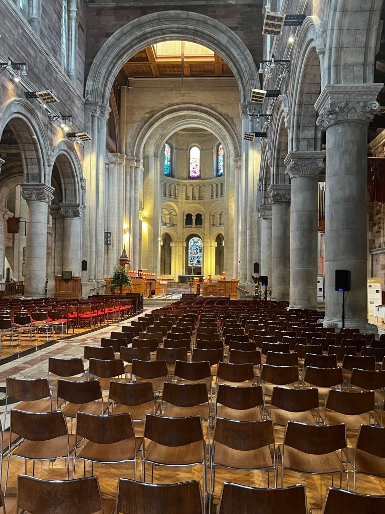 A 210ft bell tower was originally intended to be built for the Cathedral, linked to the ambulatory. However, because the ground the Cathedral is built on could not support the weight, a competition was organised to find a designfor a spire. Beneath large areas of the centre of Belfast, are deposits of wet estuarine clay, known locally as “sleech”. Since it has never been subjected to pressure it has not been consolidated and gives very little support for the building. The Spire of Hope won this competition as its lightweight, innovative design ensured that additional strain was not placed on the Cathedral.