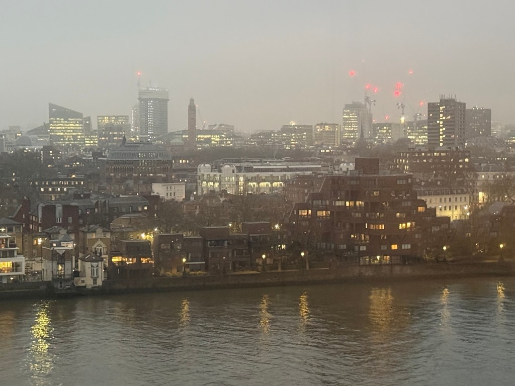 It’s “froggy” in London as well as about 40°, and combined with the late afternoon arrival, it’s already a bit dark. We took the Tube to the nearest stop to our hotel, which looks out over the Thames River.