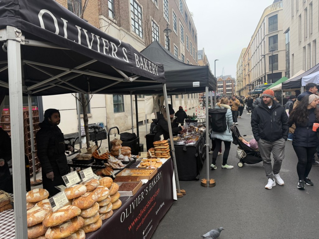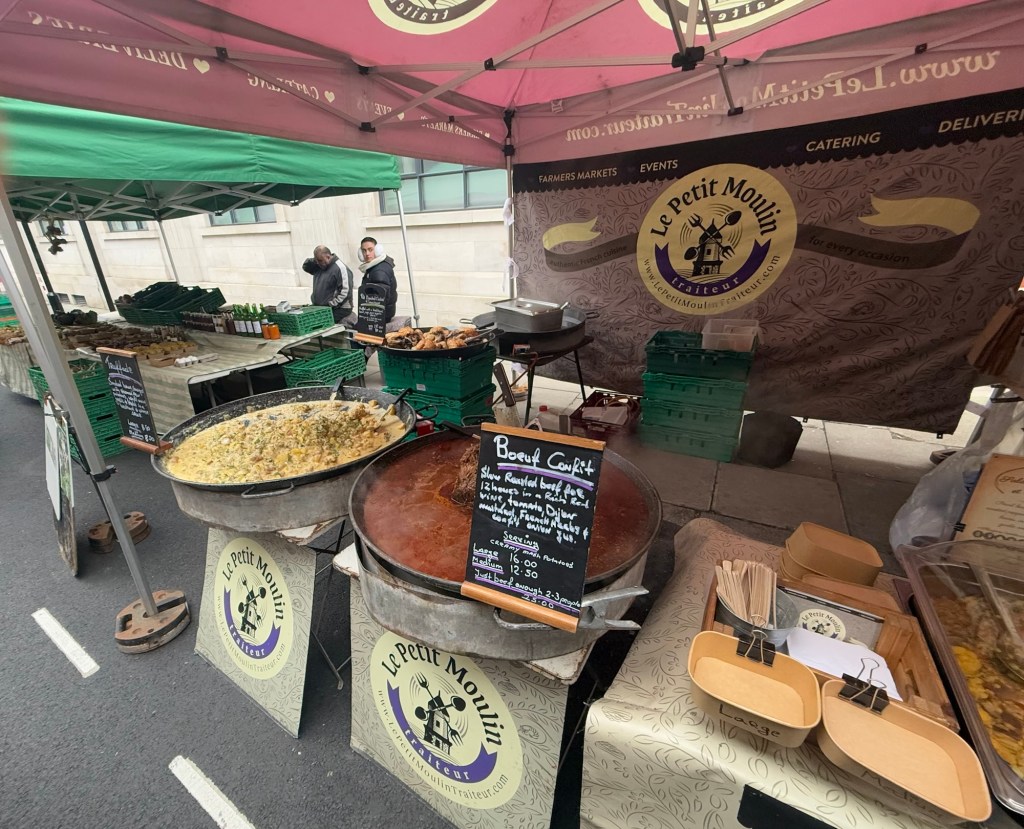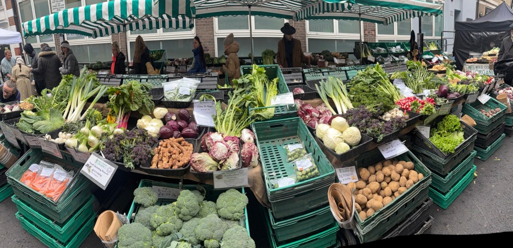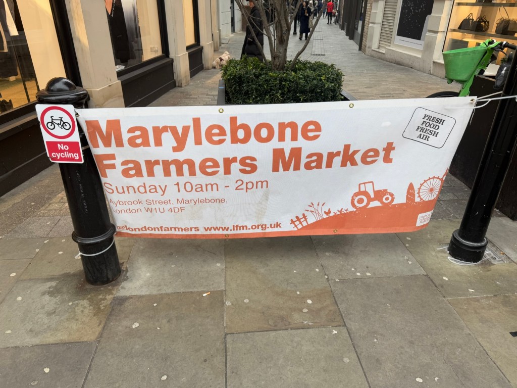 Marylebone has a farmers market on Sundays between 10 am and 2pm. It’s really for locals, not a huge affair, but it spans several long blocks and parts of several adjoining blocks ; it’s held in the area of St Vincent’s & Aybrook Street, ending around Moxon St. It’s pretty chilly this morning at 36°F (2°C) , so we have a brisk 15 minute walk to get there.
