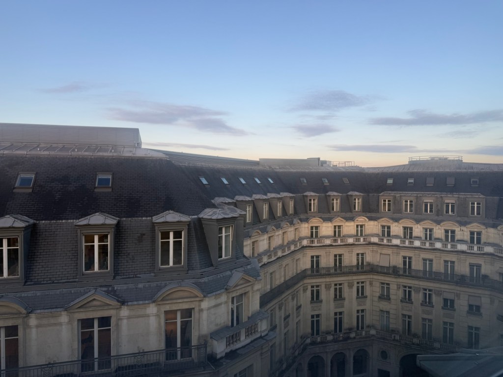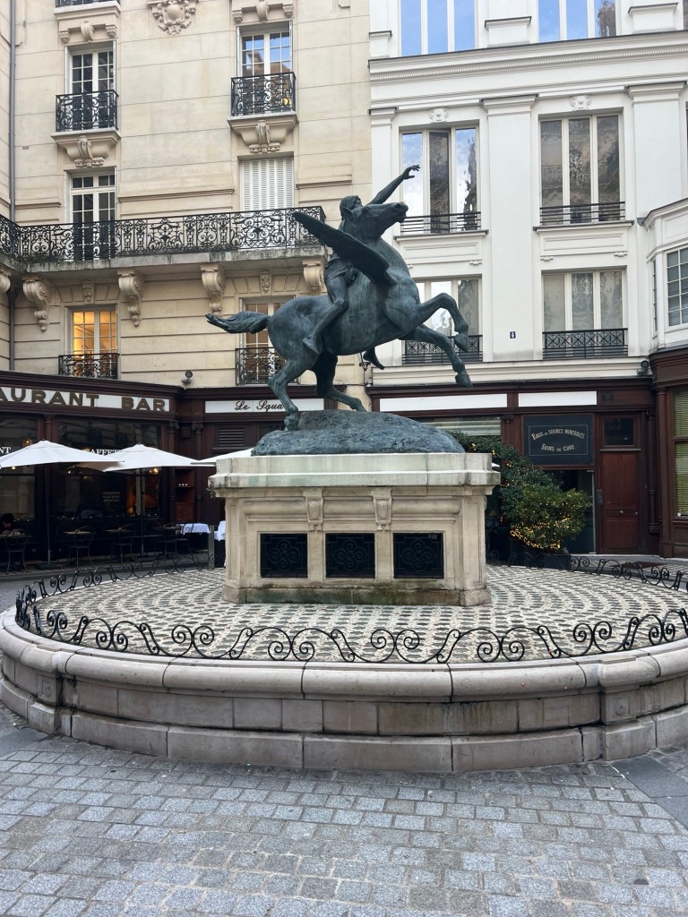 We’re staying at a new hotel in Paris, but in the same general area we usually stay. The room is on the top floor, but the sleeping area is up a set of stairs and maybe it’s the attic? (no traffic noise though ). It has a small window that looks out on the buildings across from us and down into the square below.