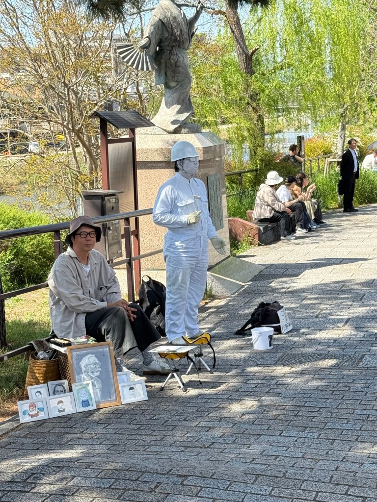 On leaving, we walked back to the Kami River banks , where there was a mime (something we’d not seen before here) and a statue commemorating the founder of kabuki.