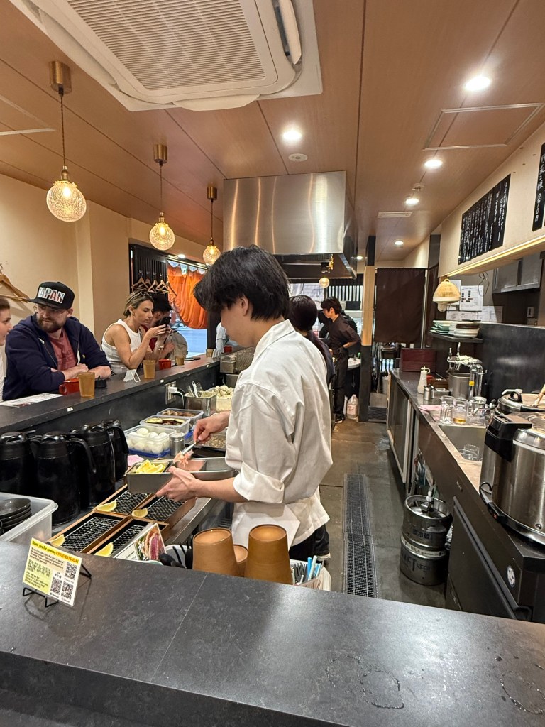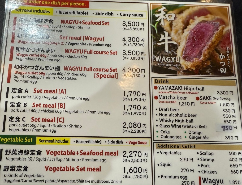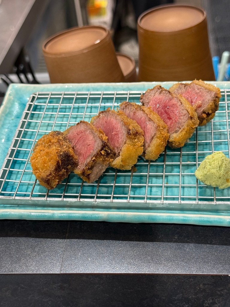 Kyoto Katsuda is our destination; it’s a small, 15 counter seat restaurant (four at the counter and one cook) serving a limited (4 set menus), but among them is Wagyu beef, and a tempura egg. Egg yolks here are wildly more orangey yellow. Japanese egg producers often include ingredients like paprika, marigold, or other sources of carotenoids in the hens’ diet, which result in richer, more orange yolks. The restaurant isn’t open all day; they open for lunch, then close for a few hours, then open back up at 5pm. We were there at 5:15pm and all 15 seats were full. We waited outside for 45 minutes…Finally, our time came.
