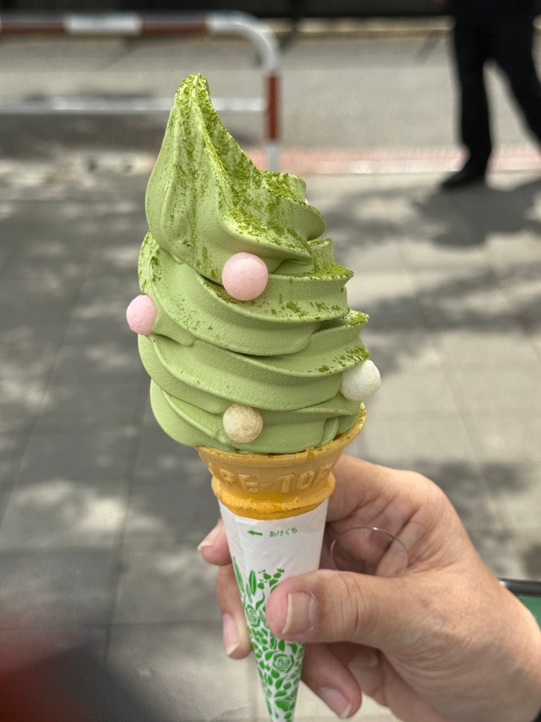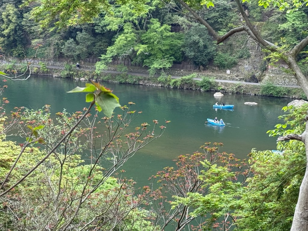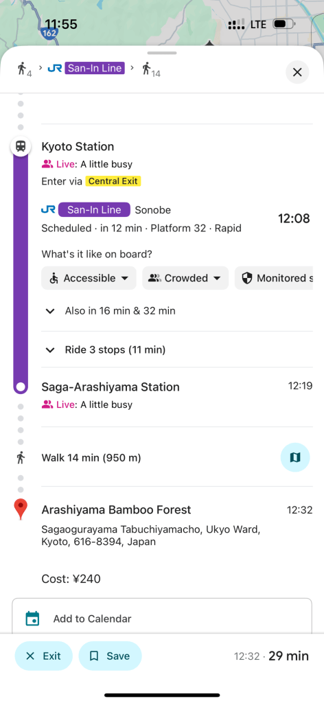 We took a bus to Kyoto’s main train station , then bought tickets for the short trip on JR (Japan Rail) on Sagan line, to Saga-Arashiyama. “Arashiyama” technically refers just to the mountains south of the Oigawa river, but is commonly used to name the entire district. The train is incredibly cheap, costing $3.28 (480¥ one way ) for two (we spent more for a matcha ice cream cone that).