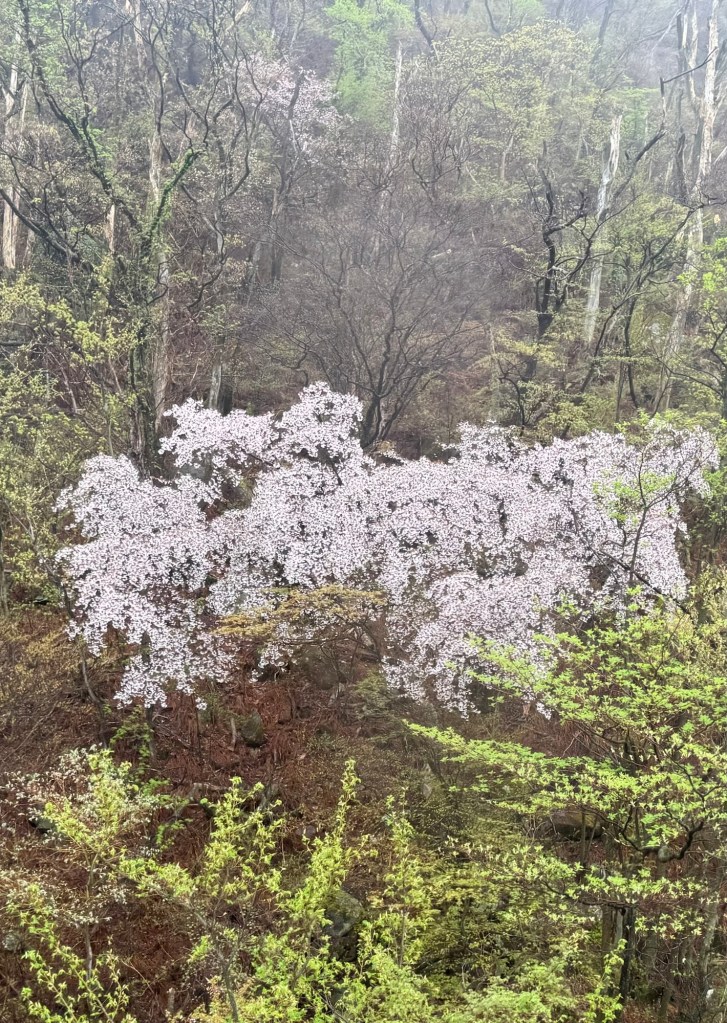 The cable cars take us up and over the mountains, where there are huge evergreen trees and deciduous trees that are only starting to bud out; the forest is peppered with blooming cherry trees and dogwoods.