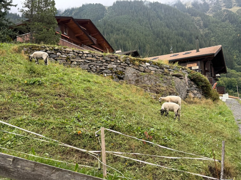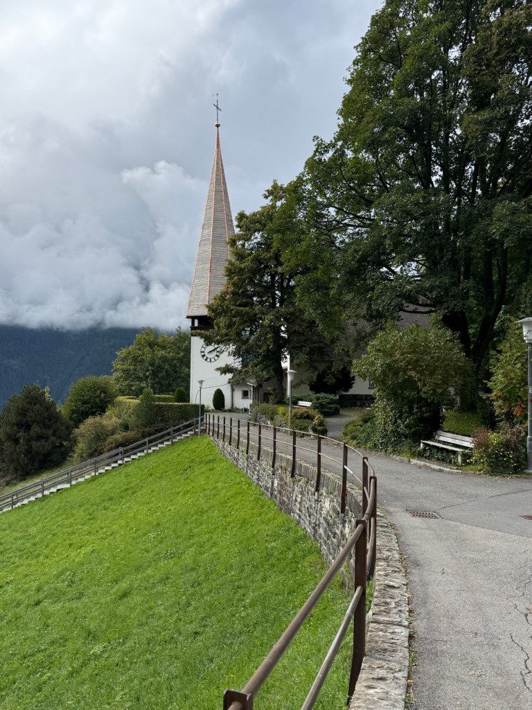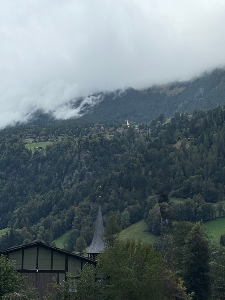 We had hoped for another activity today, but the weather didn’t cooperate. The forecast said 95% chance of rain, but fortunately, it only drizzled lightly a few times. But although we didn’t really have rain, the clouds descended lower into the valley, making going higher up in altitude (Grindelwald, Kleine Scheidegg, Mannlichen…) a pointless journey. Early in the morning, the clouds drifted through the mid altitudes where we are (4180’) , sometimes the clouds meant it was hard to see across the walkway to the other apartments, then minutes later, visibility was much better.