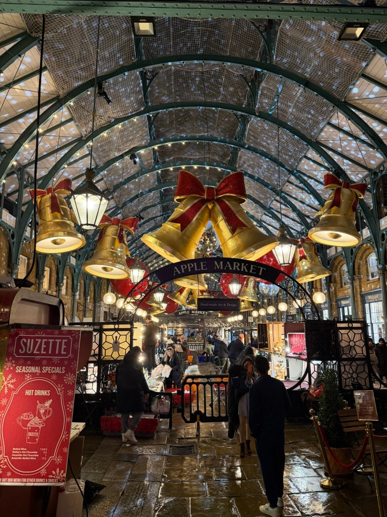 It had largely quit drizzling by the time the play was over, so we met up with a family member at Covent Garden, where Christmas lights lit up the Apple Market and a large outdoor tree is lit.