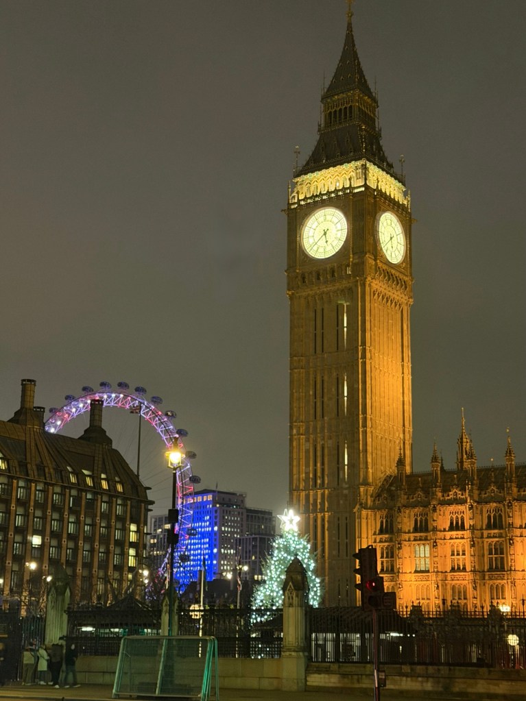 Across from the Abbey is Parliament with the Elizabeth Tower (Big Ben), while in the distance, the London Eye is lit with Christmas colors
