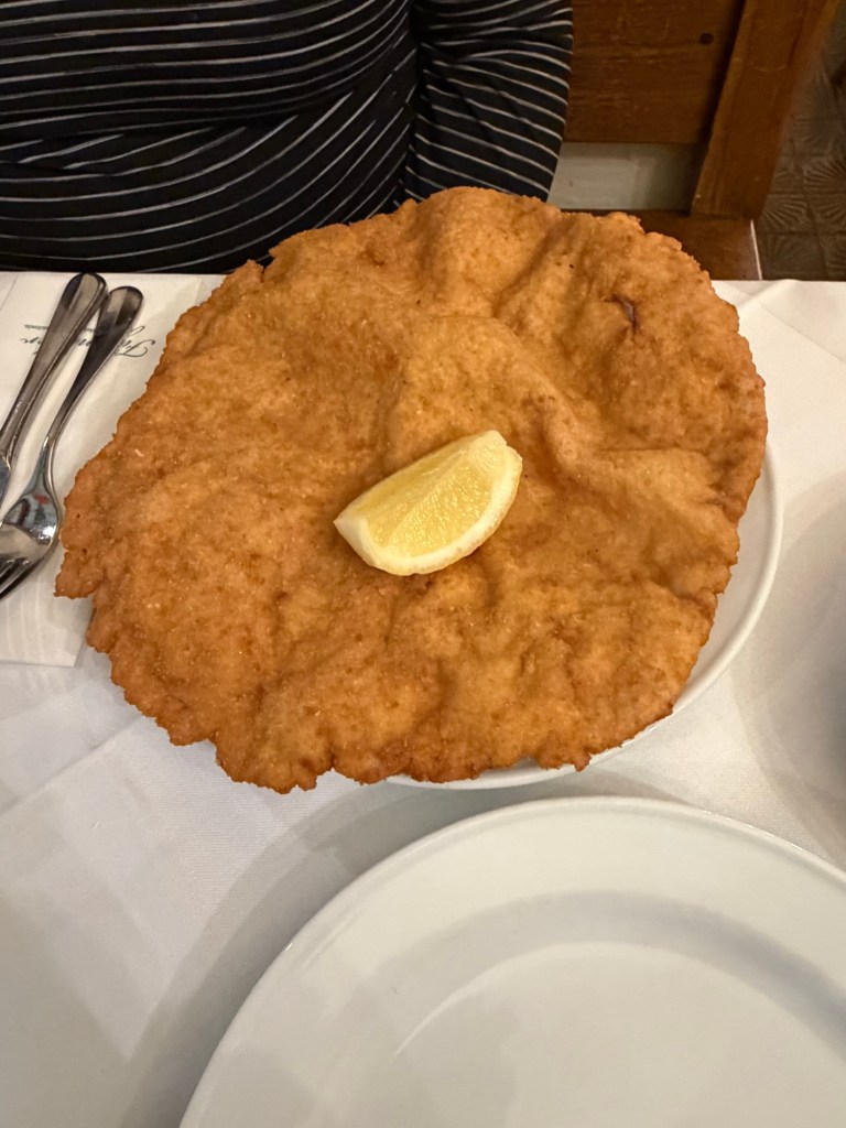 We ordered one schnitzel to share. It was larger than the plate and neither of us could quite finish our one half, though we saw a table of four order one per person.