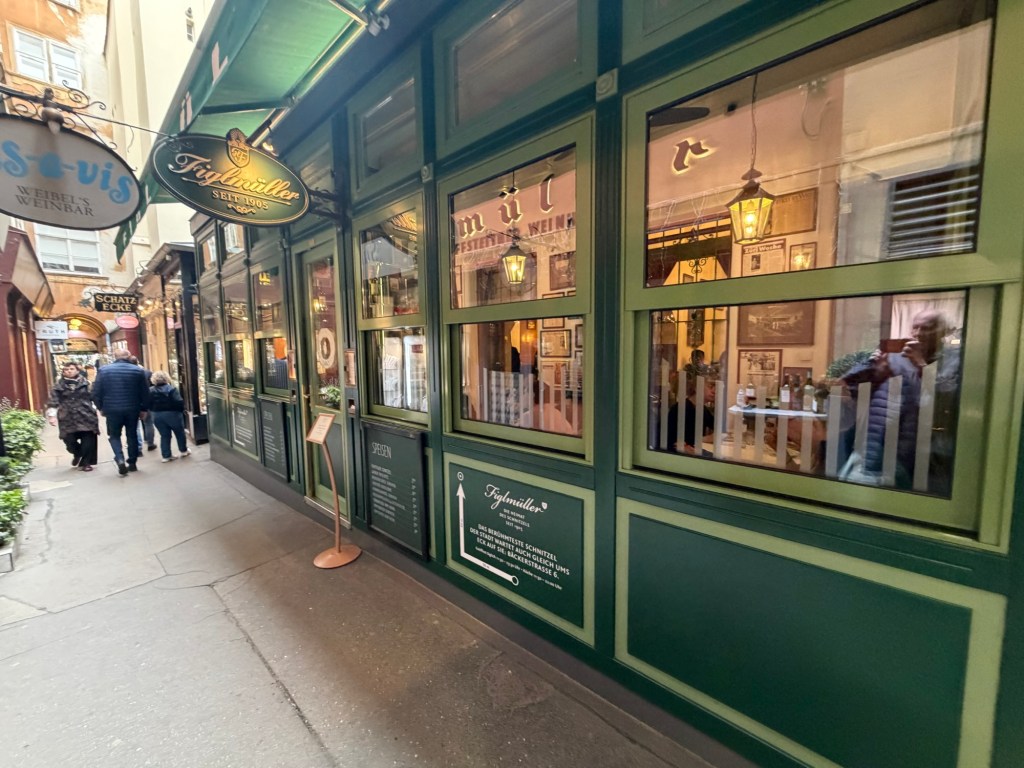 We had a reservation in town for a late afternoon“linner” (lunch+dinner) at a classic venue for Wiener Schnitzel at Figlmüller. Figlmüller has been serving Wiener schnitzel since 1905. It’s very close to Stephansdome and if you didn’t know where it was, you might not find it, as it’s down a narrow pedestrian side street.