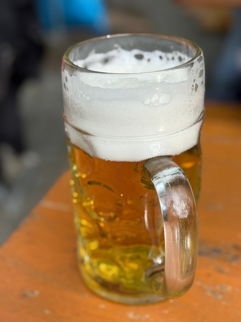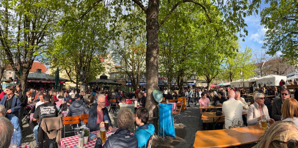 From Maxmillianstrasse we walked past Hofbrau Haus , then over to one of our more preferred Biergartens at the Viktualienmarkt. By this time, it was a beautiful afternoon with only a few scattered puffy white clouds overhead. The Biergarten’s horse chestnut trees were partially leafed out and the tables busy, but much easier to find a place to sit than in peak summer.