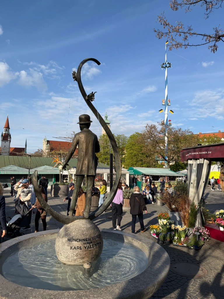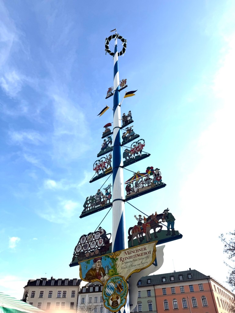 The Maypole in Munich’s Viktualienmarkt is a central landmark that is traditionally painted with blue and white diamonds and shows figures of the Bavarian way of life. It stands in the heart of the market, near the beer garden, and is considered one of the most important Maypoles in Munich.