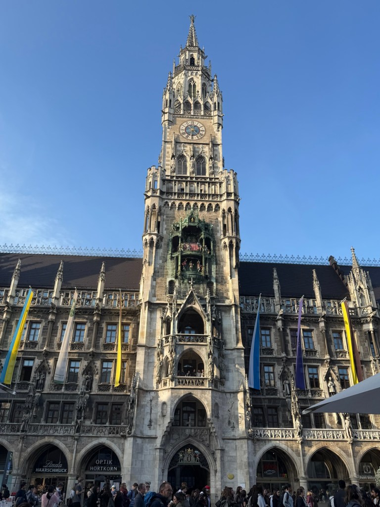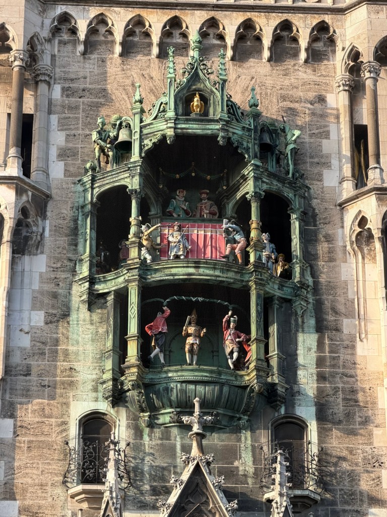 At the heart of the Marienplatz stands the Neues Rathaus (Neues = “new” city hall; rat= advise/counsel) with its famous glockenspiel.