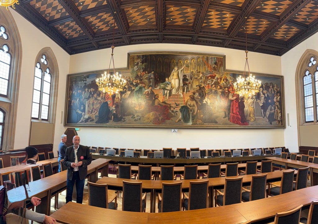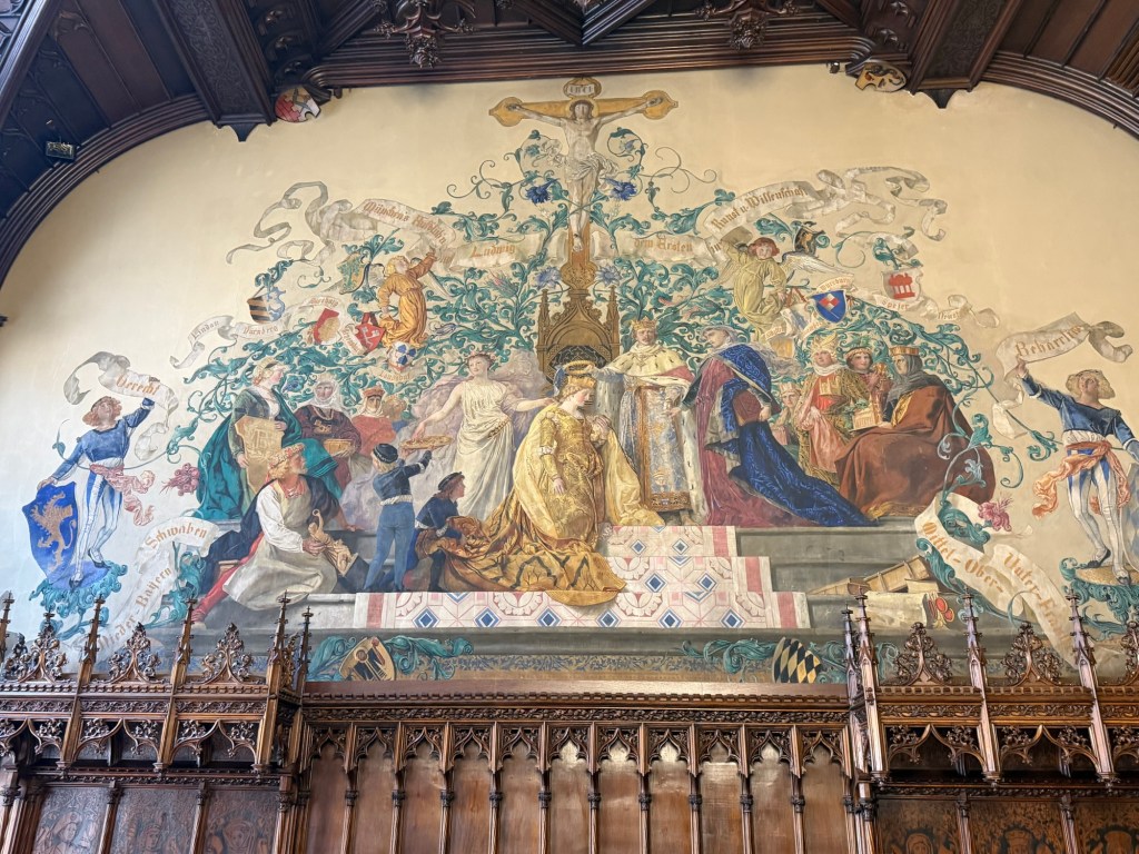 We went up wide stone staircases in the central part of the building to three floors. The Neues Rathaus is a functioning city hall , but interestingly, has three mayor’s positions—a Lord Mayor (Oberbürgermeister) and two Deputy Mayors (Bürgermeister)—to ensure continuous administrative leadership and reflect the political balance of the city’s coalition government. The newly elected Lord Mayor comes from the Green Party, which overturned 4 decades of the SPD party dominance. Munich is typically governed by a coalition of political parties (currently a Green-SPD-Volt alliance). To reflect this, the three mayor positions are usually distributed among the coalition partners.