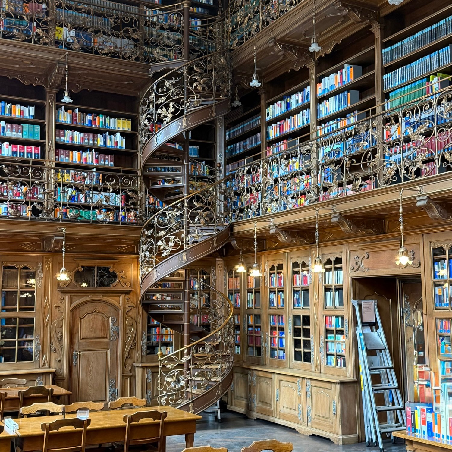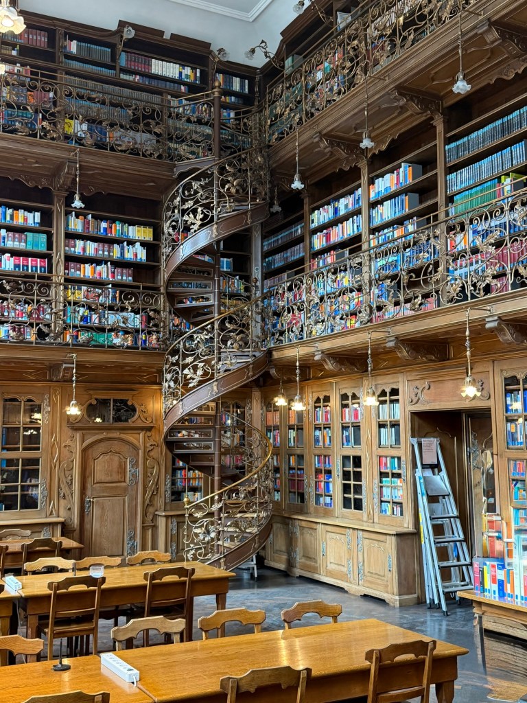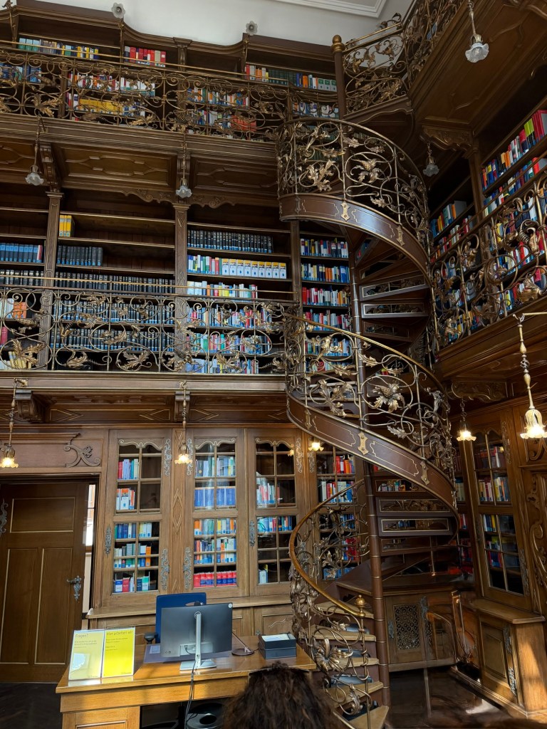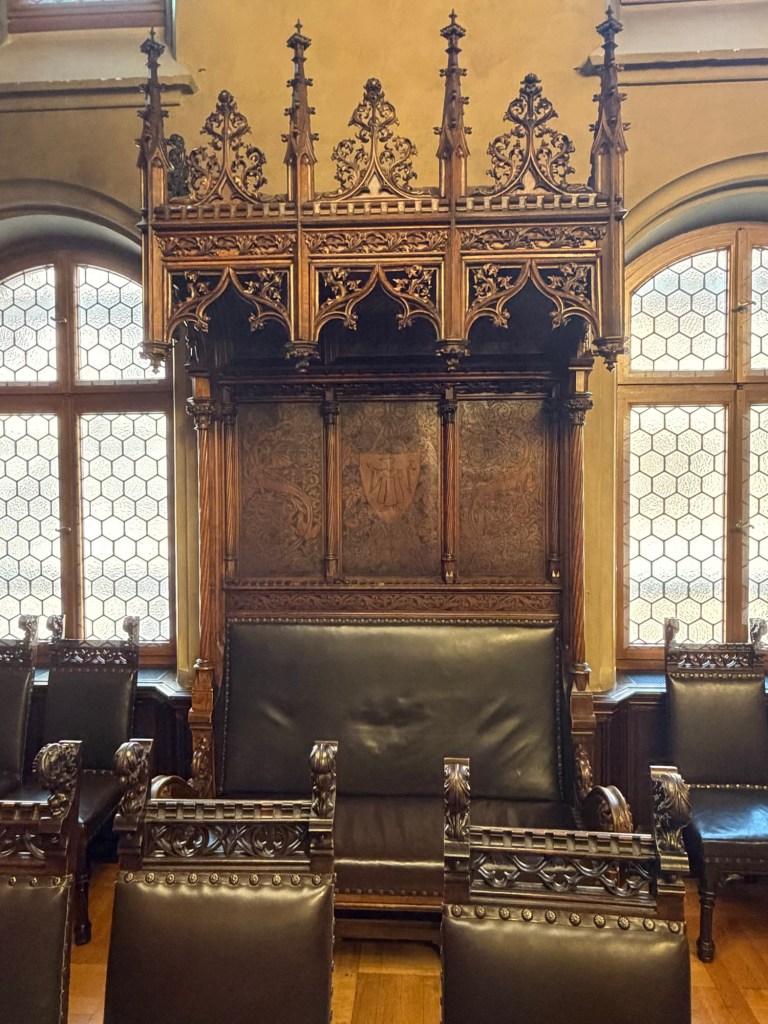 For us, the highlight of the tour was the law library. This library is not public and is used by university student studying contemporary law (so no old law books in Latin), but the two story library is lavish in its Art Nouveau style , contrasting with the gothic style of the Rathaus itself. The library was constructed during the project’s third phase and was completed in 1906.
