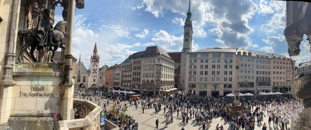 The Neues Rathaus was started at a time when Munich’s population was rapidly expanding, which was actually the reason why part was built with brick (the right hand side, built 1889-1892), while when the left hand side was added (1898-1905), doubling the size, was built with limestone blocks, something I’d never noticed when looking at the building. Munich experienced explosive population growth. The population of Munich was only 24,000 in 1700, but it doubled every 30 years. During the 1800s, it transformed from a provincial town of roughly 40,000–50,000 residents into a major European city with 100,000 in 1850 to over 500,000 people by 1900. The population increased fivefold in the half-century after 1850 alone. The “Altes Rathaus” (old city hall, or what’s left of it) is across the square to the right.