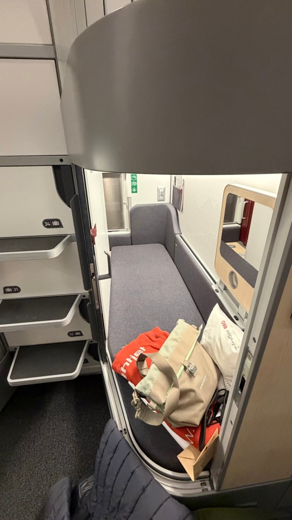 We chose a new “experience” for our overnight “sleeper”. In our four decades of train travel in Europe , we’ve had three distinct experiences with “sleepers”. The first was many years ago and was a (nice) two bed compartment with its own bath. The second and most frequent for us have been couchettes – there are usually 4-6 in a compartment (depends on what you pay) There were also couchettes on this train. Luggage storage in them is underneath lower bunks or an overhead rack. It’s a place to lie down and if there are actually 6 in one compartment, it can be really crowded (I’ve sometimes “slept” with my luggage) . This is the third type of experience on a sleeper for us; we had what’s termed a mini cabin on Nightjet. I’ll call them sleep “pods”, as mini cabin is a bit generous for the space. Each pod was (LxWxH 190 x 63.5 x 90 cm) or in old math: 6.2’ long, 2.1’ wide, 3’ in height. They were 2 high , with luggage storage in the middle (those steps you see in the middle luggage storage area is where you step to go to the upper pods), with 2 more pods on the right hand side. Of the three types we’ve tried , this is second “best”. It was pretty new, and compartment was close to the bathroom (important when you get old 😉) . Pro tip: always wear shoes when you go to use the bathroom on the train.